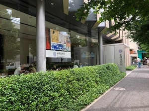 山種美術館のお気に入りはロビーにある明るくカジュアルなカフェ。いつも展覧会の内容に合わせた和菓子が登場します。今回は『初夏』(水辺に咲くカキツバタ)という名の和菓子と冷抹茶のセットでアフタヌーンティーです。